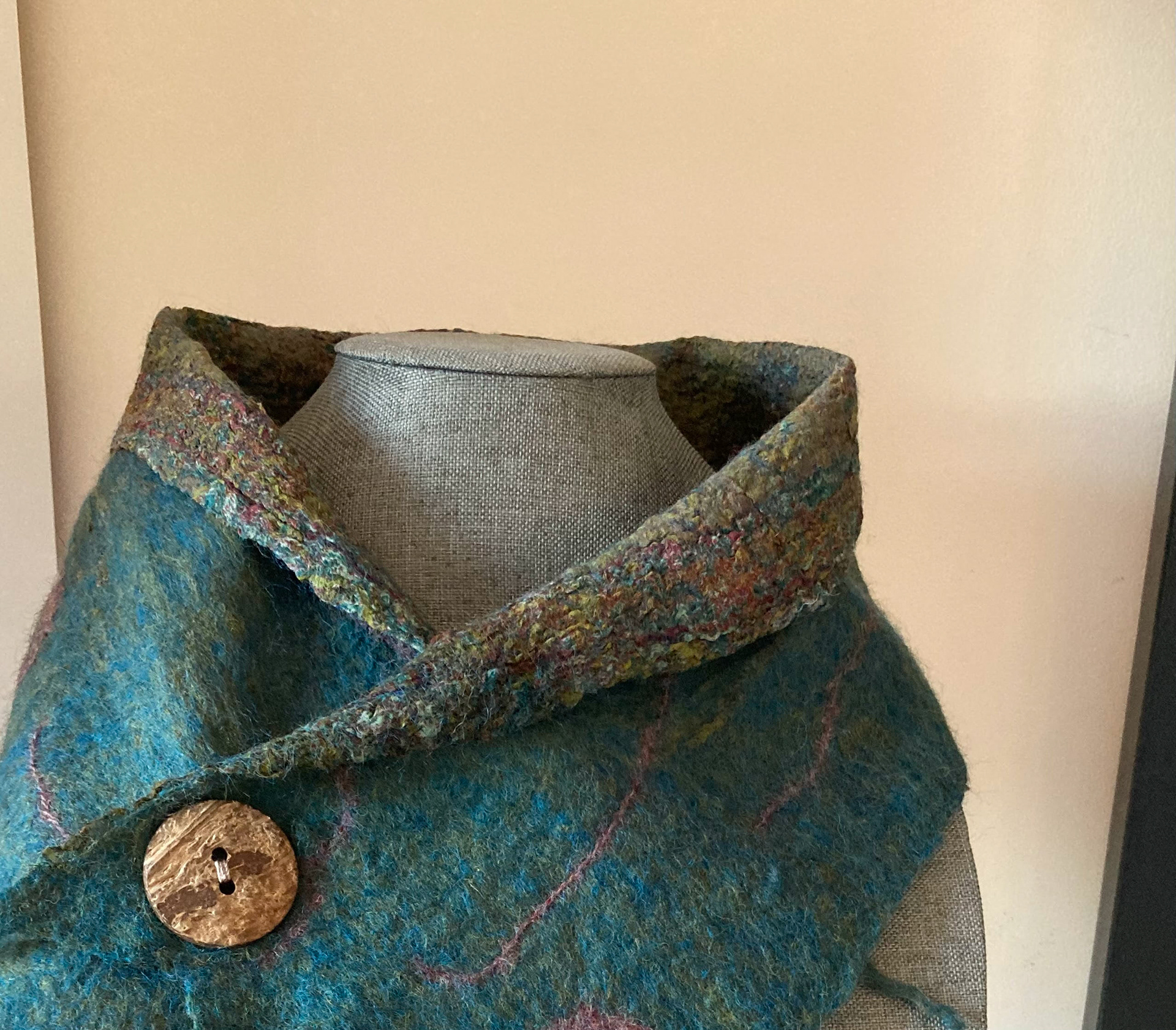 Through using sustainable fibers, my present work pays homage to my childhood home which sits mere feet from the ocean and its rugged coastline. As a young girl I would spend many days around the water, watching as it washed against the granite rocks and collecting capelin as they rolled ashore. To me the ever-changing ocean patterns seemed immutable. I draw on these points of inspiration when creating my felted pieces. What is now impacting my thought process and work is the awareness of Climate change as it affects our way of life. By choosing sustainable medias and my desire to contribute to the creative preservation of our province of Newfoundland and Labrador, I am making a difference.