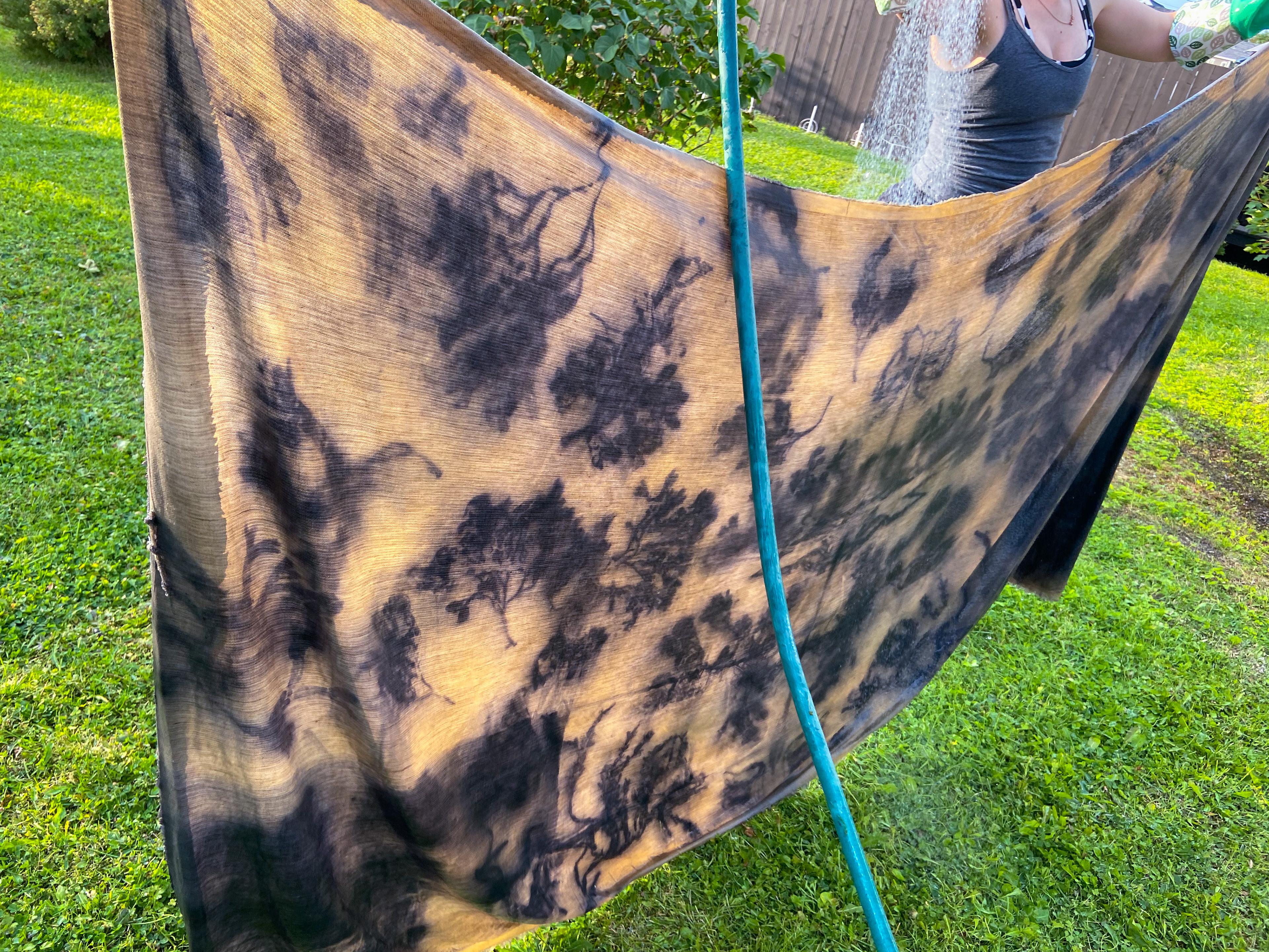 Techniques used: Natural vat dying, eco-printing, machine sewing, hand stitching.